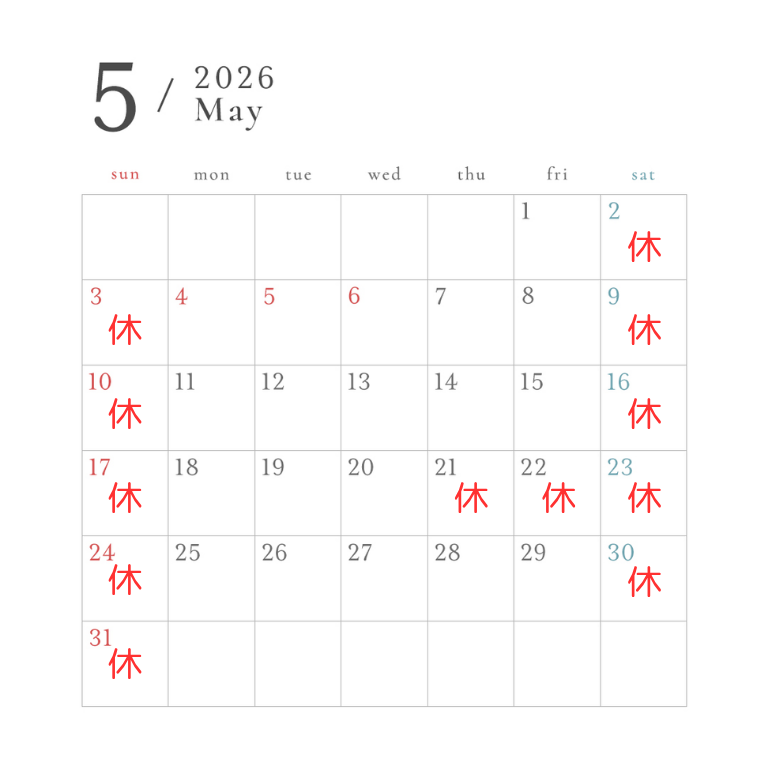 【5月の営業日・休業日のお知らせ】いつもご利用いただきありがとうございます。5月の営業日・休業日についてご案内いたします。